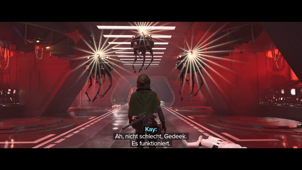 Geradeaus befinden sich Lüftungsgitter an den Seiten, die geöffnet werden können. Kriecht in den Schacht hinein. Durch den Computer wurde hier das rote Kraftfeld ausgeschaltet und ihr verlasst den ISB-Raum hier geduckt über den Wartungsbereich. Schwingt euch mit Griffhaken und Seil an die Gitterwand. Hinter der nächsten Tür erwartet euch Gedeek.