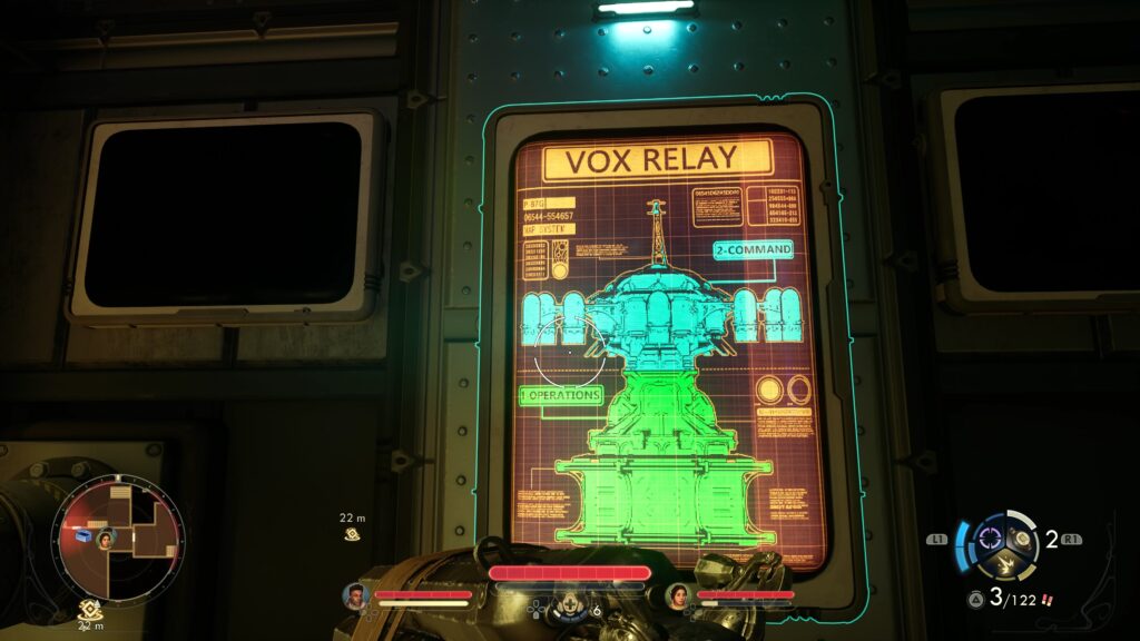 Nach der Kaserne erreicht ihr wieder den Anfang der Vox-Station beim Treffpunkt mit Corbin und der abgeschlossenen Tür der großen Halle. Am Ende der Halle befindet sich der Aufzug hoch zur Kommandozentrale. Aber davor warten, neben Dragoonern und schwebenden Drohnen, vor allem mehrere Protektorats-Sniper auf euch.