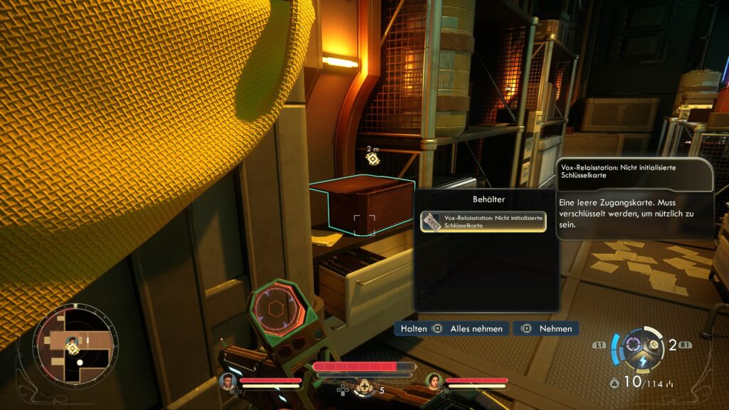 Schaut euch im Schmuggelgutlager um. Bei den Regalen auf der linken Seite liegt in einer braunen Kiste die Vox-Relaisstation: Nicht initialisierte Schlüsselkarte. Nehmt die Karte und plündert andere interessante Sachen im Schmuggelgutlager wie z.B. ein Hochsicherheitsschließfach. Verlasst das Lager über den Lüftungsschacht in der Nähe über der braunen Kiste mit der Schlüsselkarte. Als Nächstes muss die Karte noch im Sicherheitsbüro autorisiert werden.