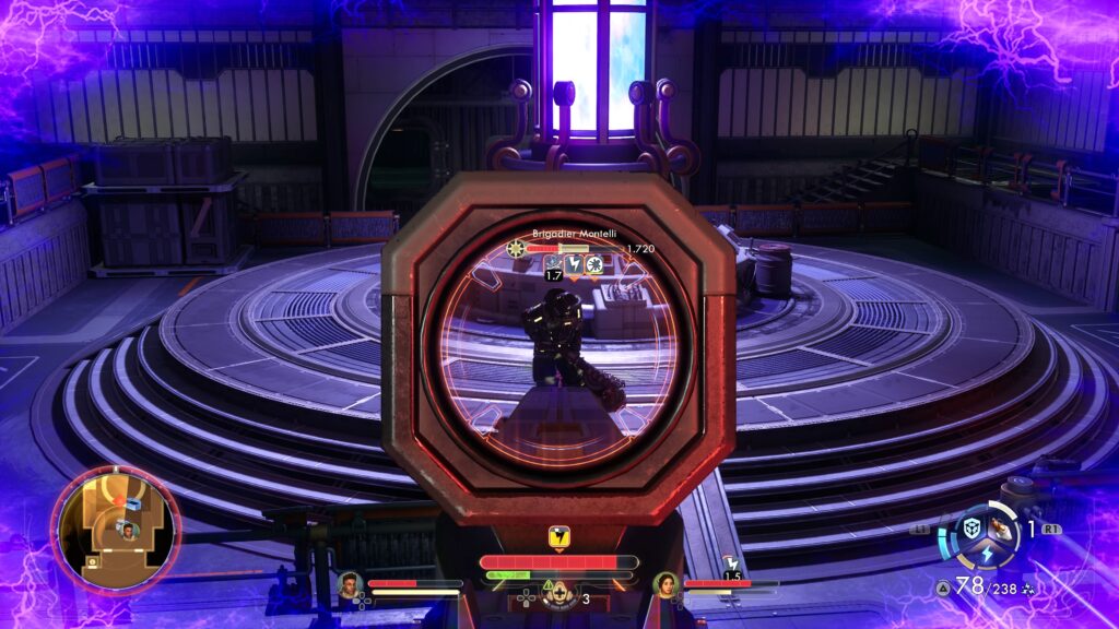 Montelli hält sich im Kampf immer auf der runden Plattform im Zentrum auf. Wenn ihr nicht zwingend auf den Nahkampf angewiesen seid, bietet sich der erhöhte Balkon am Ende des Raums ideal für Angriffe an. Dort taucht auch ein Scharfschütze auf, den ihr unbedingt schnell erledigen solltet. Andernfalls werdet ihr ständig zusätzlich vom Sniper beschossen. Nach dem Sieg dürft ihr das einzigartige Schockmaschinengewehr Kettenfunkenkanone einpacken.
