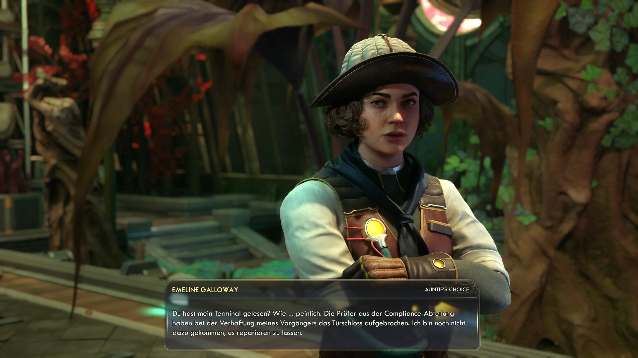 Im Gewächshaus erwähnt ihr nun im Dialog mit Emeline die gerade gewonnenen Informationen. Zuerst den Terminaleintrag aus der Polizeistation. Emeline gibt sich dann als Vertreterin der Sub Rosa-Fraktion zu erkennen, die den Schwarzmarkt von Arcadia kontrolliert. Außerdem bietet sie euch einen Auftrag an, um Einträge im Terminal der Nachschuboffizierin Cardosas zu manipulieren.